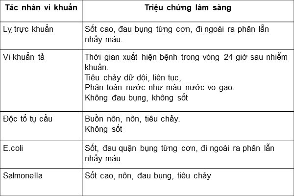 Một số triệu chứng lâm sàng do các tác nhân vi khuẩn thường gặp gây ra bệnh tiêu chảy ở trẻ là: