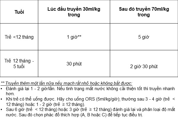 Bắt đầu truyền dịch tĩnh mạch ngay, nếu bệnh nhân có thể uống, cho trẻ uống oresol qua đường miệng cho đến khi truyền tĩnh mạch được thiết lập. Truyền 100ml/kg dung dịch ringer lactate chia ra như sau: